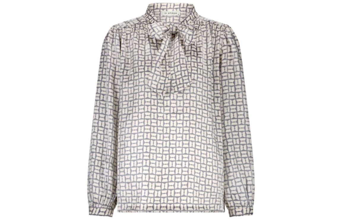 In Shape Daniela INS2530508. Dit rechtvallend model is voorzien van een ronde hals met v-inkeping dat sluit door middel van een strik. Deze anthracite kleurige blouse van In Shape is bewerkt met een grafische print uitgevoerd in een glanzende stofkwaliteit.