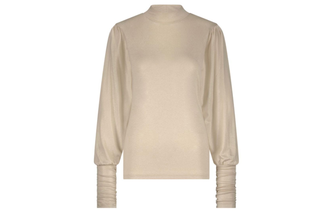 In Shape top INS2530102. Dit rechtvallend model is voorzien van een turtle neck en heeft lange mouwen afgewerkt met gedrappeerde details aan de onderzijde. Deze zand kleurige top van In Shape is bewerkt met glitter all-over.