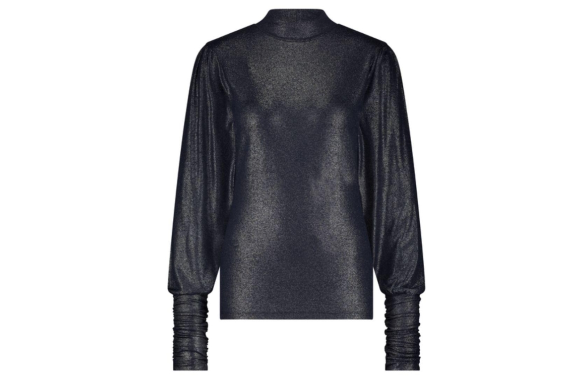 In Shape top INS2530102. Dit rechtvallend model is voorzien van een turtle neck en heeft lange mouwen afgewerkt met gedrappeerde details aan de onderzijde. Deze navy kleurige top van In Shape is bewerkt met glitter all-over.