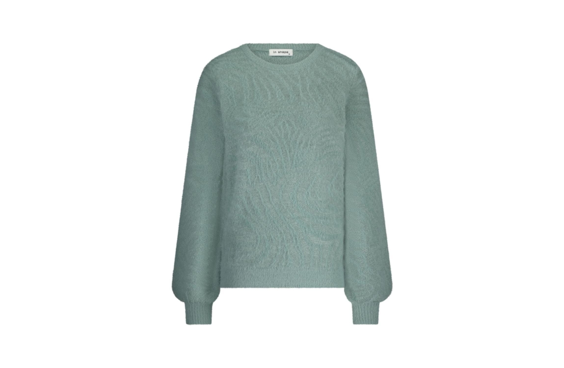 In Shape Imana 4010 Sage blue. Dit rechtvallende model is voorzien van een ronde hals en heeft lange mouwen. Deze blauwe trui van In Shape is bewerkt met een glitter en is afgewerkt met boorden.