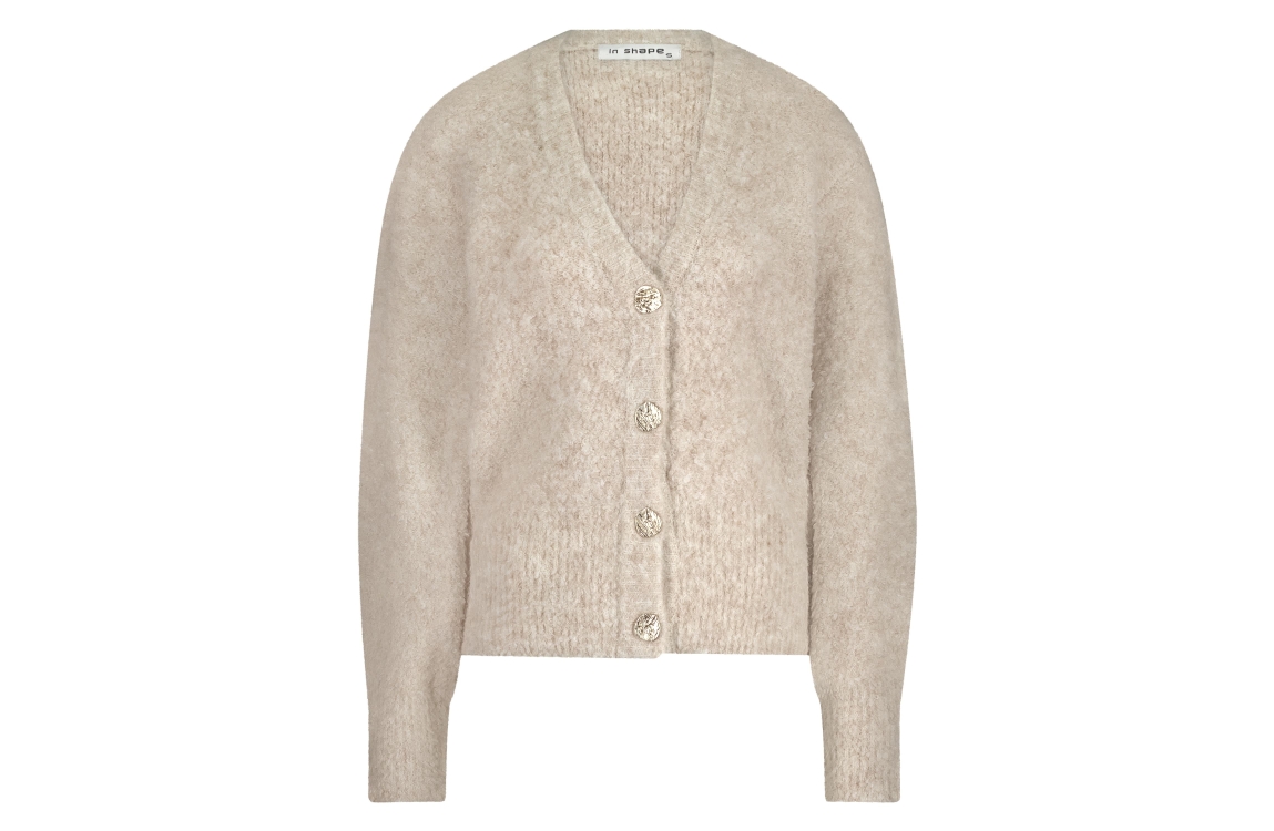 Dit rechtvallende model is voorzien van een v-hals en lange mouwen. Dit beige gilet van In Shape sluit door middel van gouden knopen en is afgewerkt met boorden.