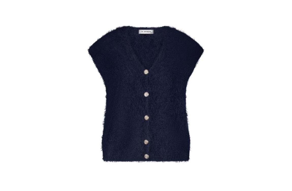 In Shape Maan 4001 Navy. Dit rechtvallende model is voorzien van een ronde hals en is mouwloos. Deze donker blauwe gilet van In Shape sluit door middel van knopen.