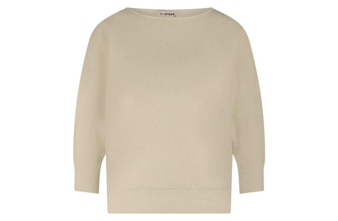 In Shape pullover India INS2610721. Dit rechtvallend model is voorzien van een boothals en heeft driekwart mouwen. Deze zandkleurige pullover van In Shape is all-over bewerkt met glitter.