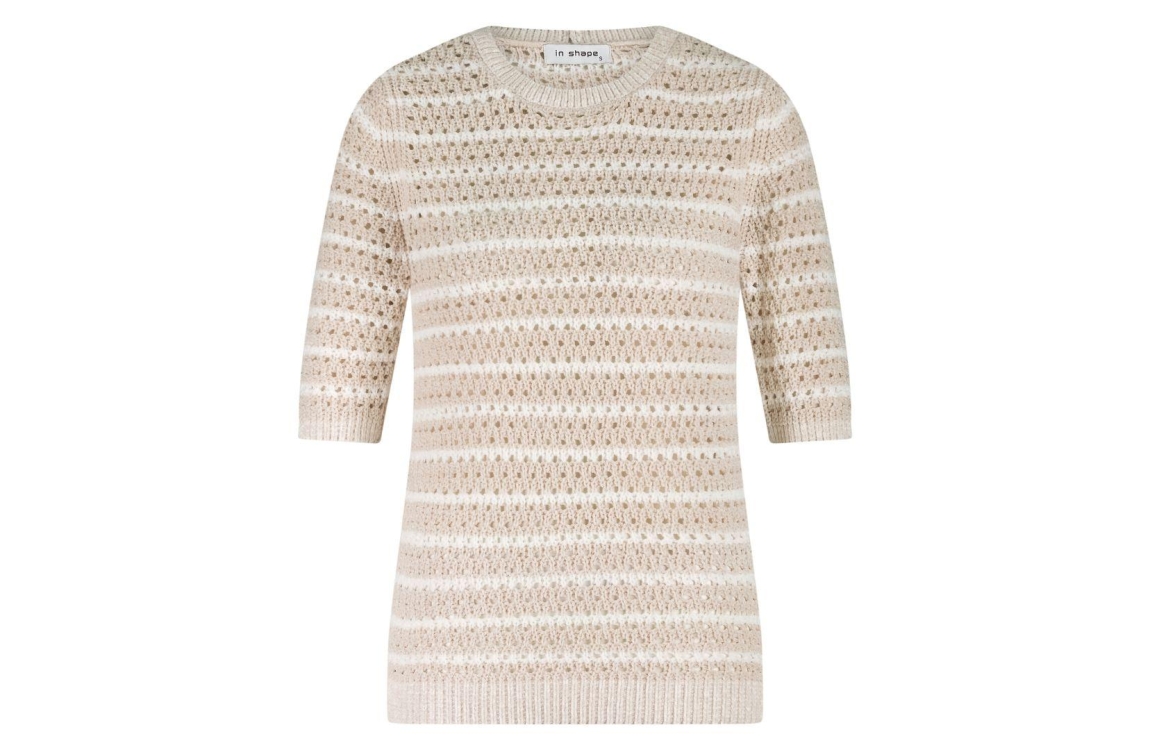 In Shape pullover Inez INS2610819. Dit rechtvallend model is voorzien van een ronde hals en heeft korte mouwen. Deze zandkleurige pullover van In Shape is bewerkt met witte strepen en all-over uitgevoerd in een zachte stof kwaliteit en met opengewerkte details.