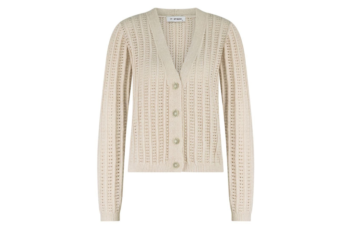 In Shape vest Isabeau INS2610920. Dit rechtvallend model is voorzien van een v-hals en heeft lange mouwen. Deze zandkleurige vest van In Shape sluit door middel van sierlijke knopen en is all-over uitgevoerd in een zachte stof kwaliteit en met opengewerkte details.