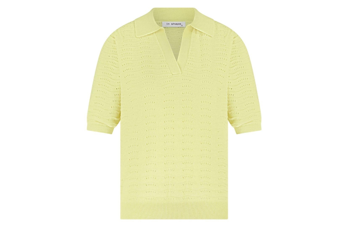 In Shape pullover Ismay INS2610822. Dit rechtvallend model is voorzien van een kraag met v-inkeping en heeft korte mouwen. Deze gele pullover van In Shape is bewerkt met open details en is uitgevoerd in een zachte stof kwaliteit.