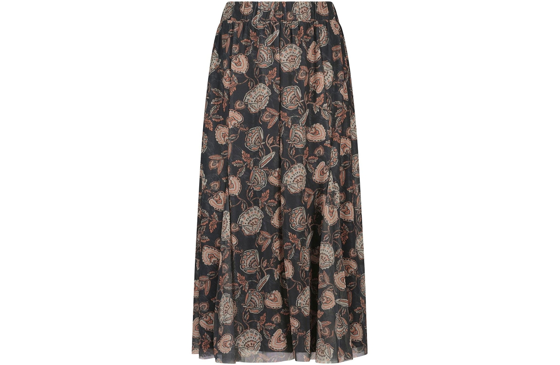 In Shape rok Kim INS2303002. Dit 7/8 model sluit door middel van een elastische boord en is all-over bwerkt met een rode/beige bloempatroon. Deze zwarte mesh rok van In Shape is gevoerd en afgewerkt met plooidetails.