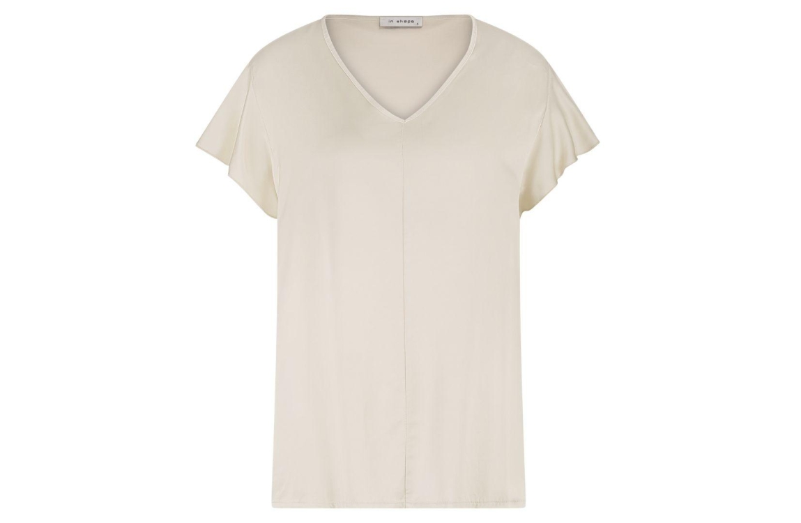 In Shape top Mirte INS2610455. Dit rechtvallend model is voorzien van een v-hals en heeft korte mouwen bewerkt met ruches. Deze zandkleurige top van In Shape is uitgevoerd in een glanzende kwaliteit.