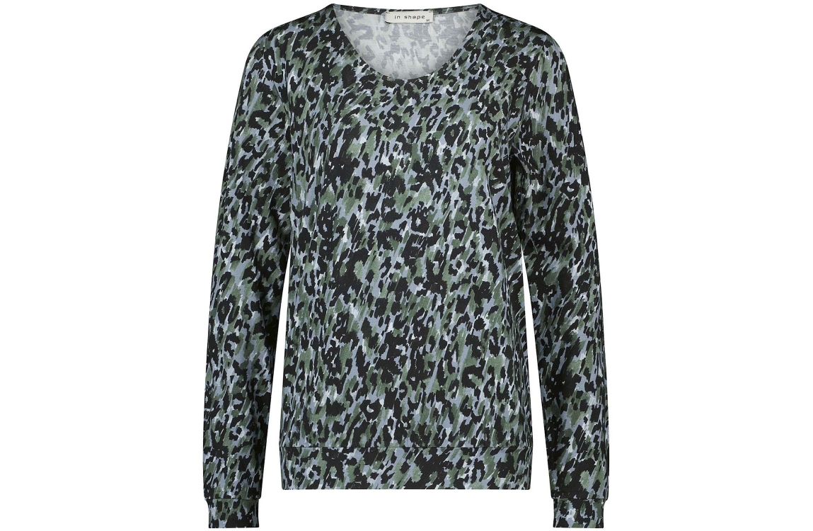 In Shape shirt INS2303027B. Dit rechtvallend model is voorzien van een ronde hals en heeft lange mouwen. Deze groen/blauwe shirt van In Shape is bewerkt met een jacquard print en is afgewerkt met boorden.