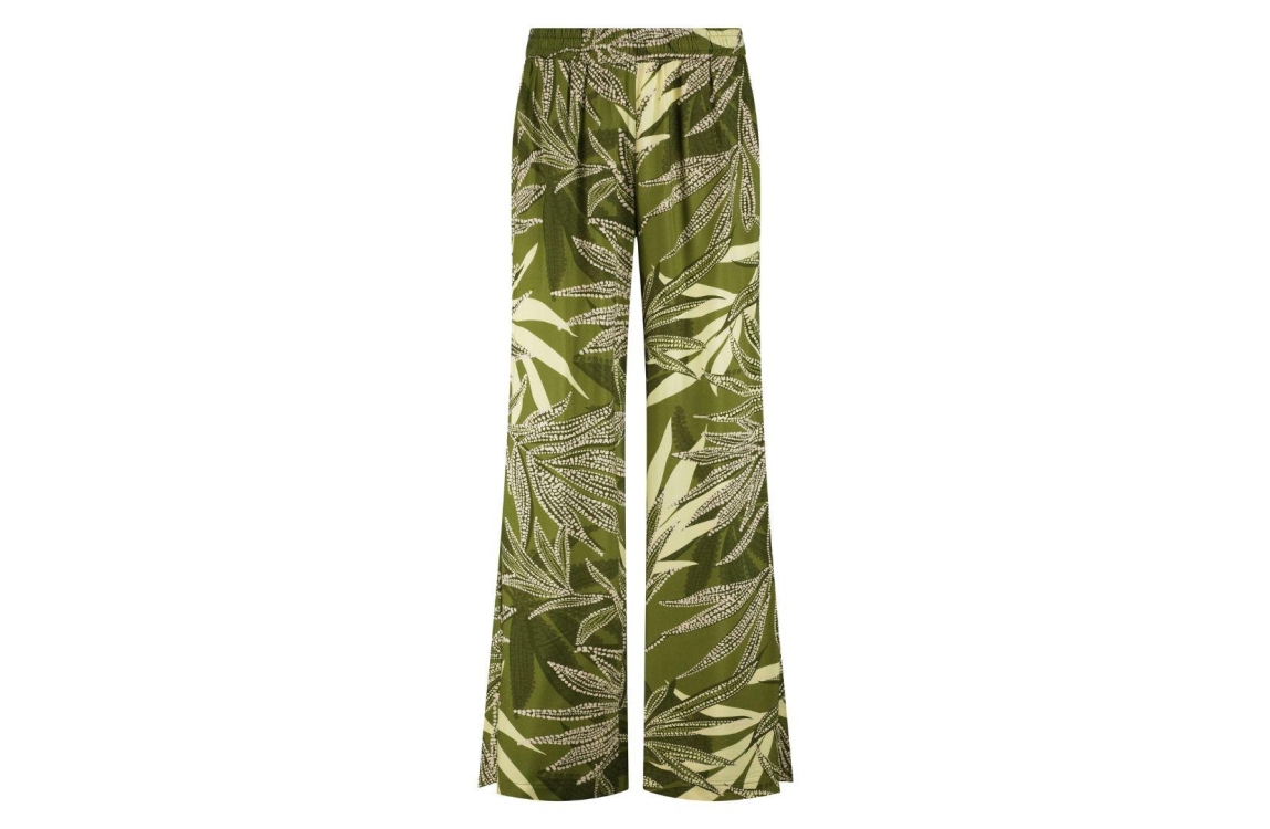 In Shape trousers Devon INS2611509. Dit wide leg model sluit door middel van een elastische boord en is voorzien van twee steekzakken. Deze groene/gele broek van In Shape is all-over bewerkt met een bladpatroon.