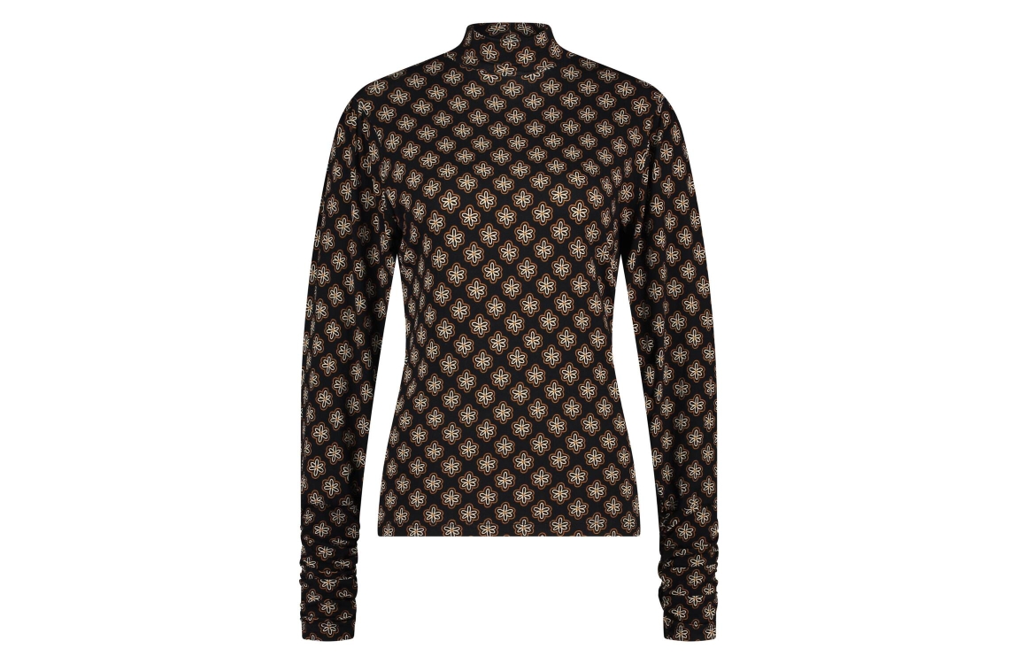 InShape shirt INS2403008A. Dit aangesloten model is voorzien van een turtle neck en heeft lange mouwen. Deze zwarte top van InShape is bewerkt met een all-over bloemenprint en is aan de onderzijde van de mouw voorzien van een rimpeleffect.