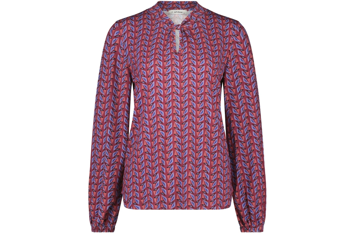 In Shape shirt INS2303072. Dit rechtvallend model is voorzien van een ronde hals afgewerkt met knoop- en splitdetail en heeft lange mouwen met elastische inzet. Deze roze/blauwe shirt van In Shape is all-over bewerkt met een driehoek patroon.