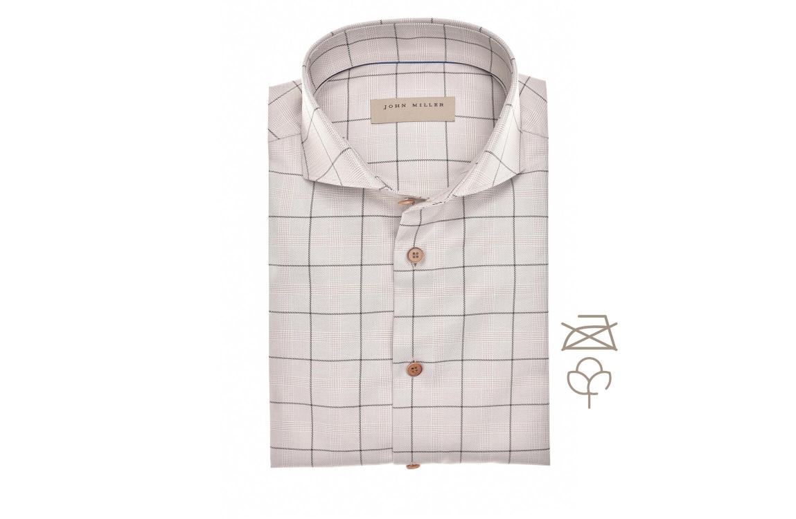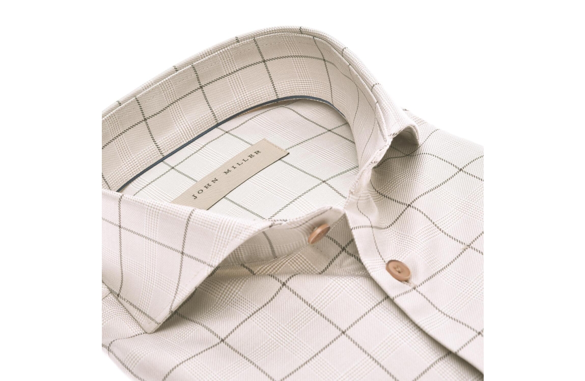 John Miller overhemd 5141835. Dit slim fit model is voorzien van een button down kraag en heeft lange mouwen afgewerkt met een split en knoop. Dit beigegeruite overhemd van John Miller sluit aan de voorzijde door middel van knopen een heeft initialen op het linker manchet.