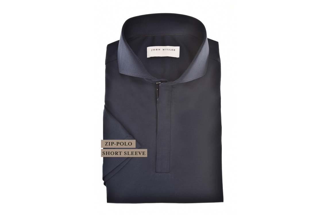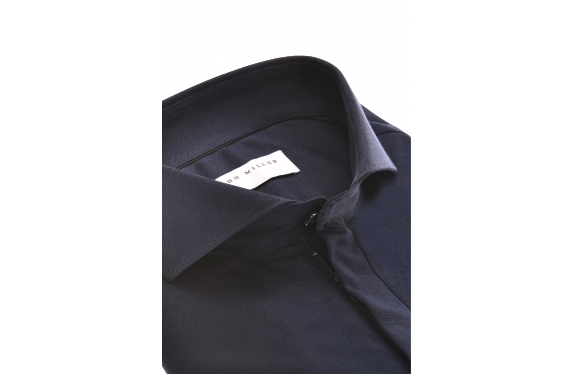 John Miller overhemd 5142722. Dit slim fit model is voorzien van een cutaway kraag en heeft korte mouwen. Dit donkerblauwe overhemd van John Miller sluit aan de voorzijde door middel van een rits.