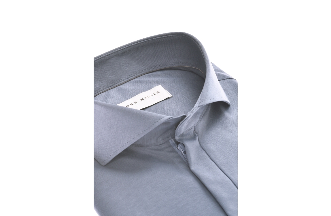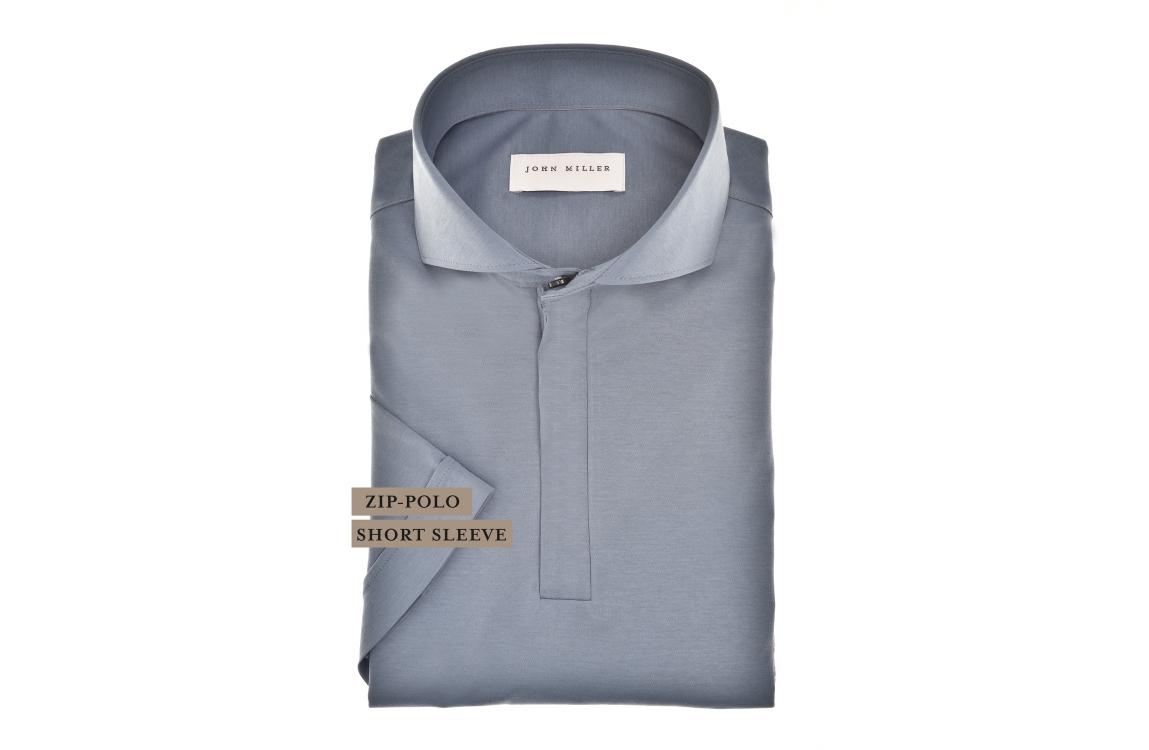 John Miller overhemd 5142722. Dit slim fit model is voorzien van een cutaway kraag en heeft korte mouwen. Dit blauwe overhemd van John Miller sluit aan de voorzijde door middel van een rits.