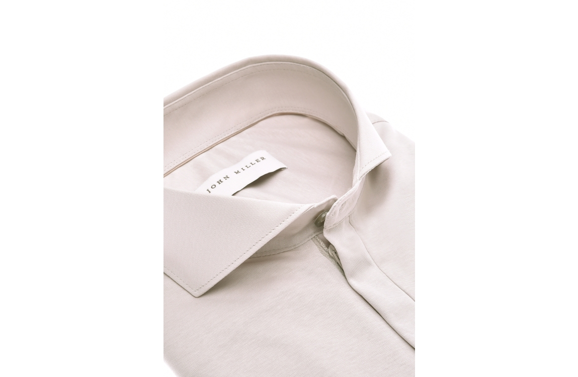 John Miller overhemd 5142722. Dit slim fit model is voorzien van een cutaway kraag en heeft korte mouwen. Dit lichtgrijze overhemd van John Miller sluit aan de voorzijde door middel van een rits.