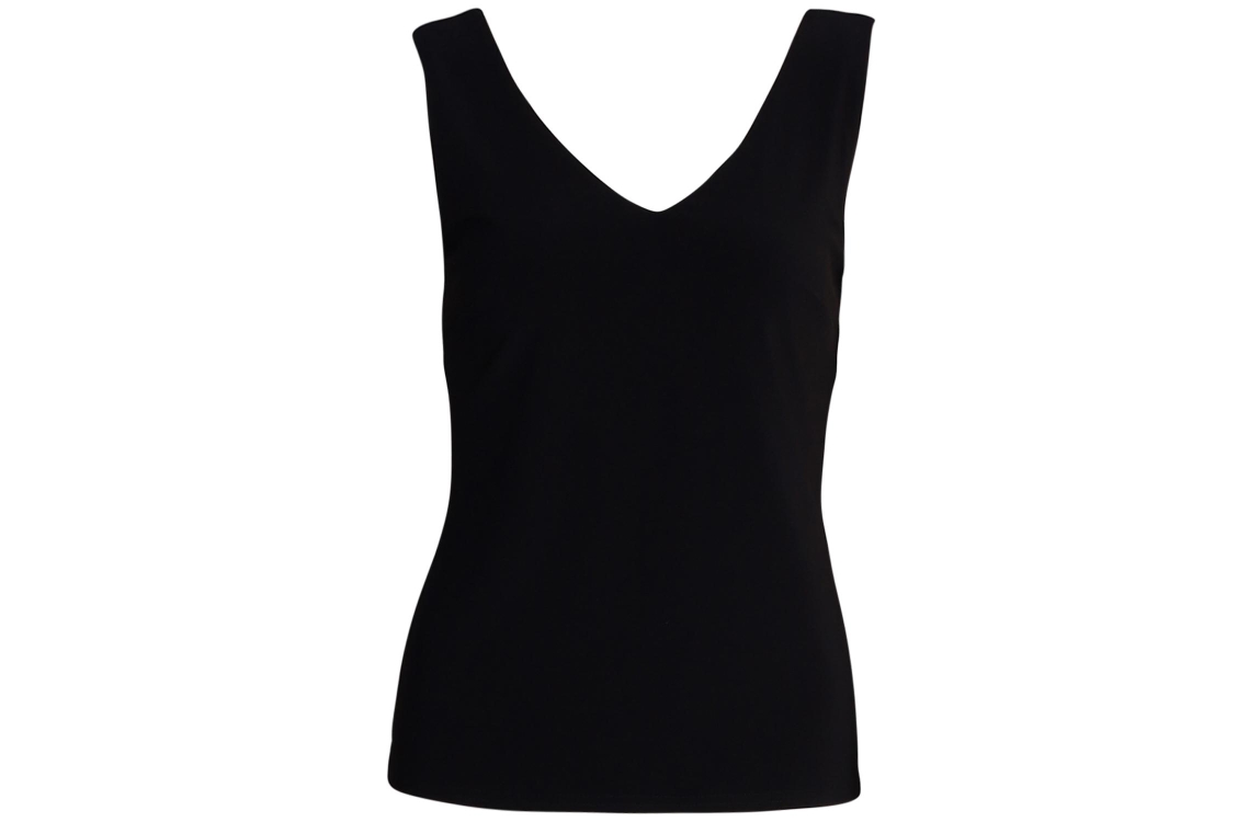 Joseph Ribkoff singlet 201546. Dit rechtvallend zwarte model is uitgesneden in een v-lijn aan de voor- en achterzijde en is mouwloos uitgevoerd.