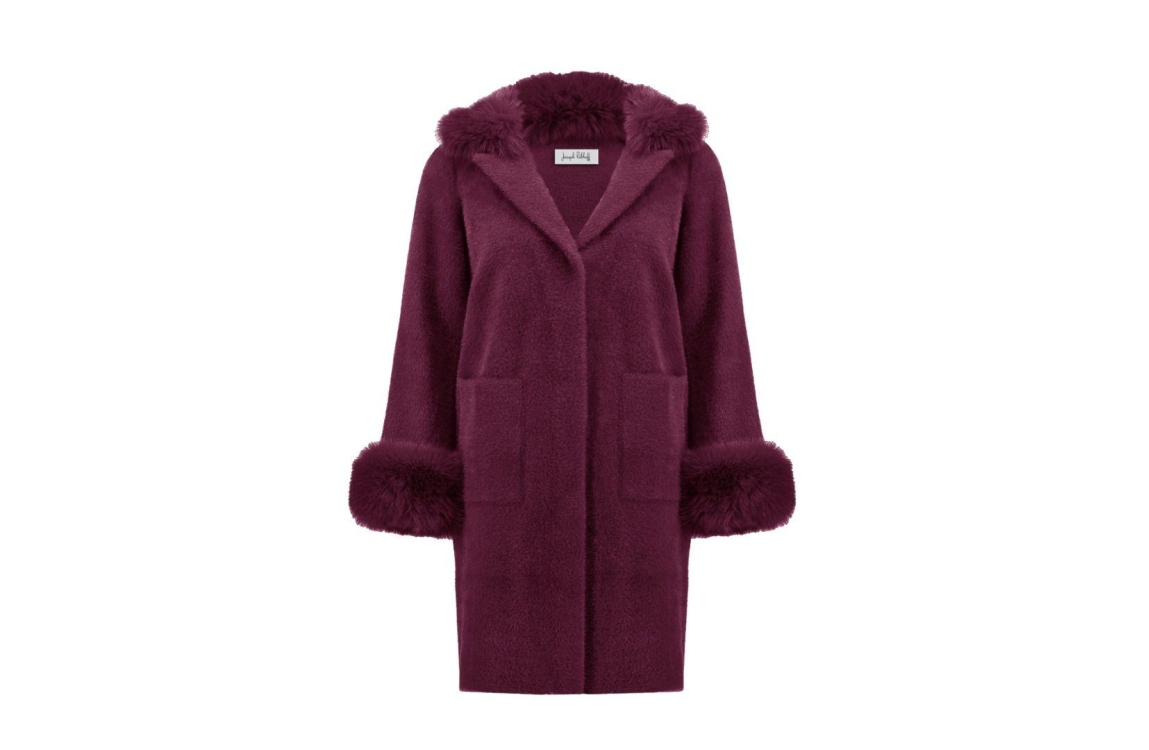 Joseph Ribkoff mantel 243923F25. Dit rechtvallend model is voorzien van een reverskraag en heeft lange mouwen. Deze wijnrode mantel van Joseph Ribkoff sluit door middel van knopen en beschikt over opgestikte zakken. Dit model is afgewerkt met faux fur.