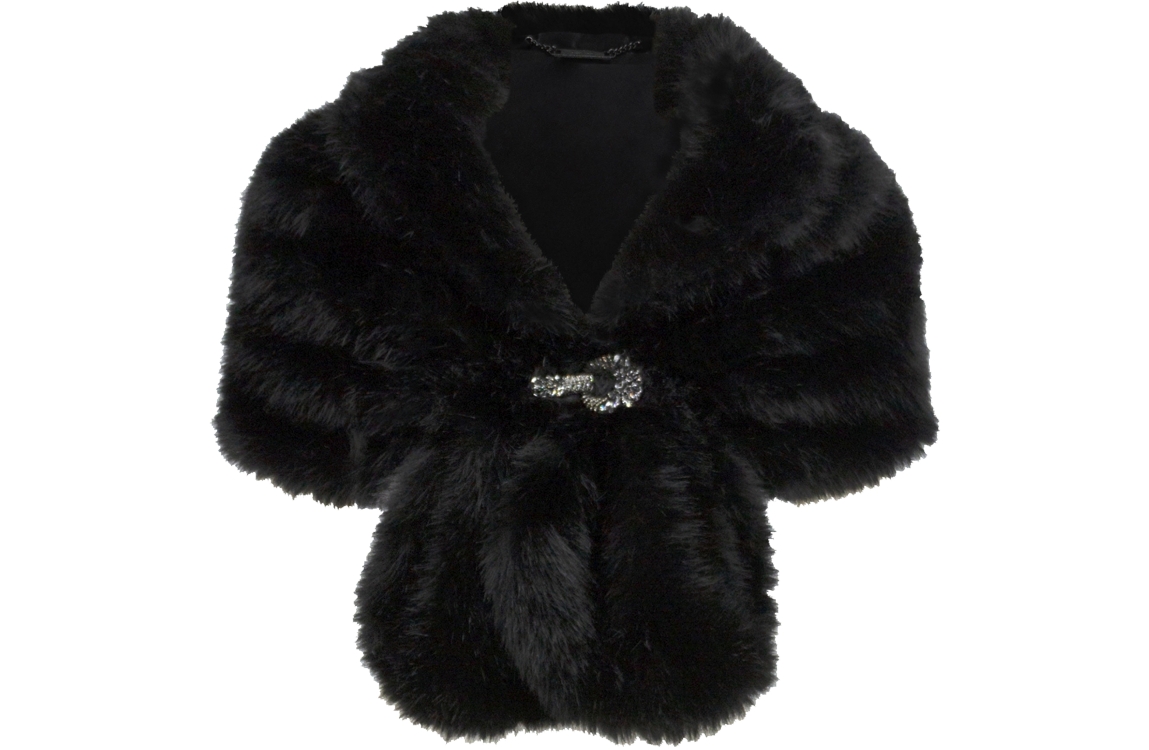 Joseph Ribkoff stola 233796. Dit elegante model is voorzien van een ronde opstaande kraag en is mouwloos. Deze zwarte stola van Joseph Ribkoff is uitgevoerd in een faux fur kwaliteit en sluit door middel van een gesp bewerkt met zilverkleurige steentjes. Dit model beschikt over een elastische inzet bij de taille aan de voorzijde.