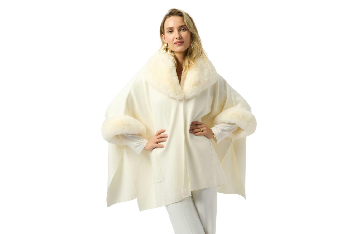 Joseph Ribkoff cover up 24390F25. Dit soepelvallend model heeft een omgeslagen kraag en halflange mouwen. Deze vanilla cape van Jospeh Ribkoff is op de kraag en mouwboorden bewerkt met faux fur en is voorzien van twee opgestikte steekzakken.