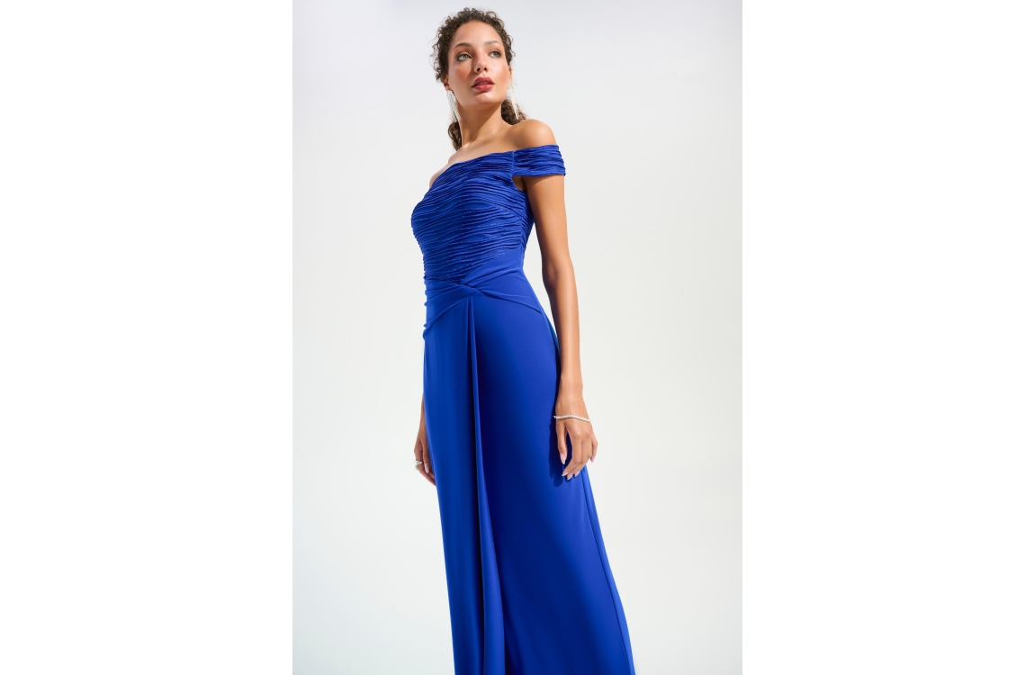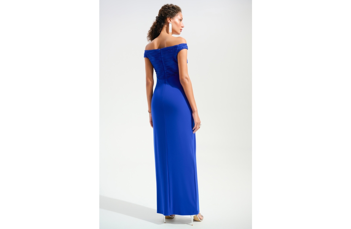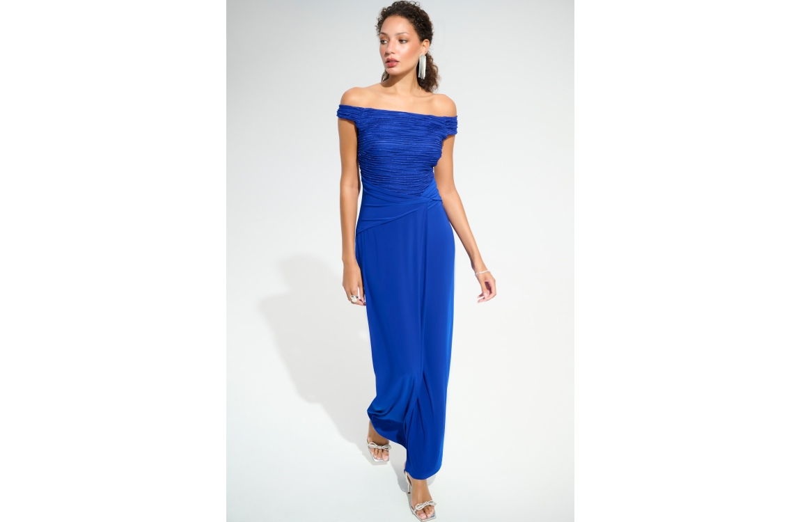 Joseph Ribkoff LDS Dress 2922 Royal Sapphire. Dit aangesloten model heeft een wijde hals en korte mouwen. Deze donkerblauwe jurk van Joseph Ribkoff is bewerkt met glitters aan de bovenzijde en heeft een gedrappeerd detail in de taille. De jurk sluit door middel van een rits aan de achterzijde.