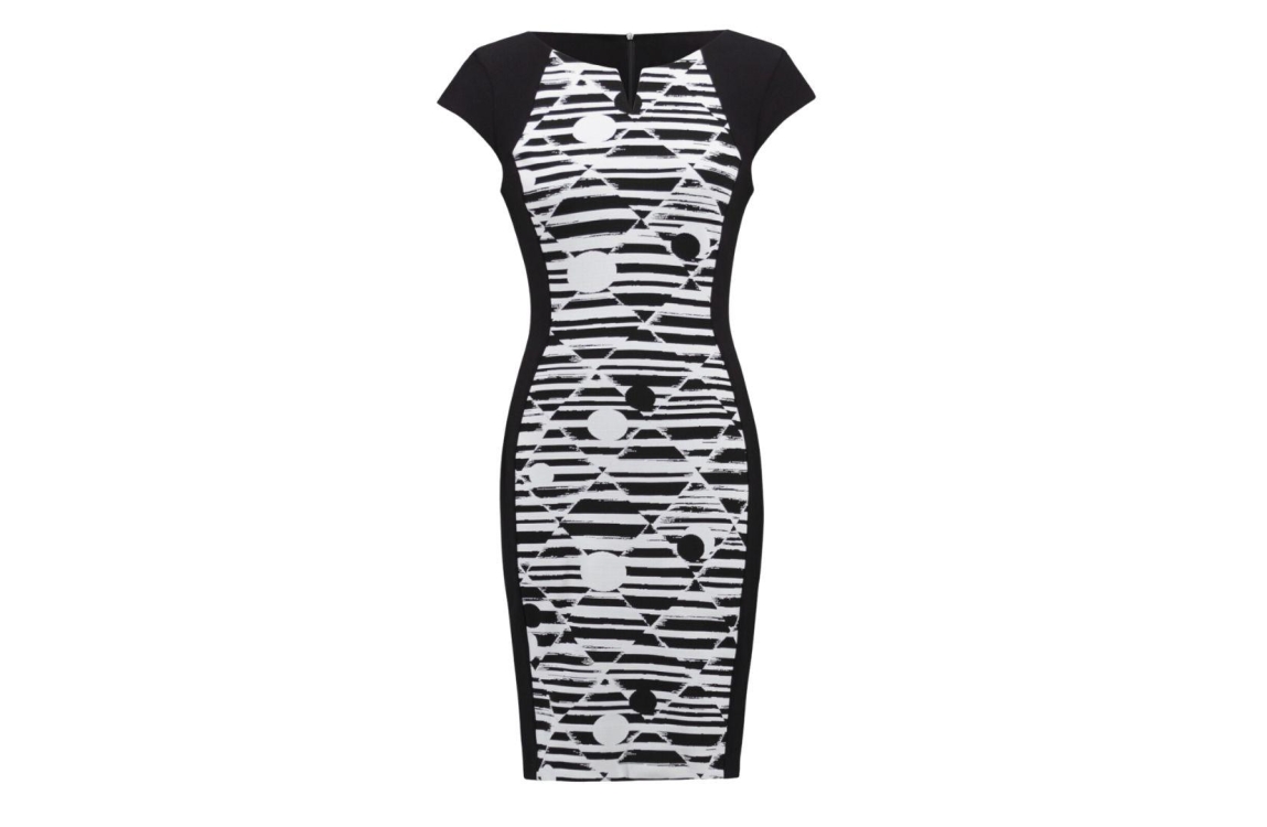 Joseph Ribkoff jurk 251237. Dit aangesloten model is voorzien van een ronde hals met v-inkeping en heeft korte mouwen. Deze zwarte jurk van Joseph Ribkoff sluit aan de achterzijde door middel van een rits en is aan de voorzijde bewerkt met een witte print.