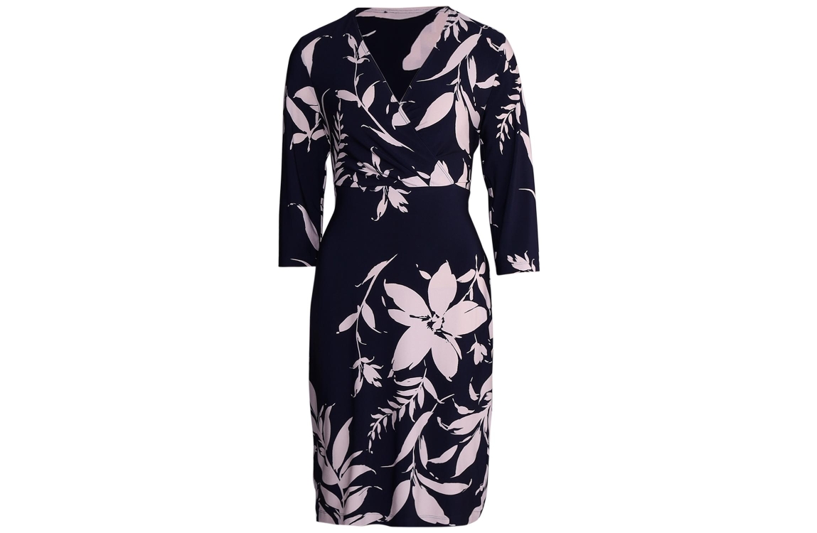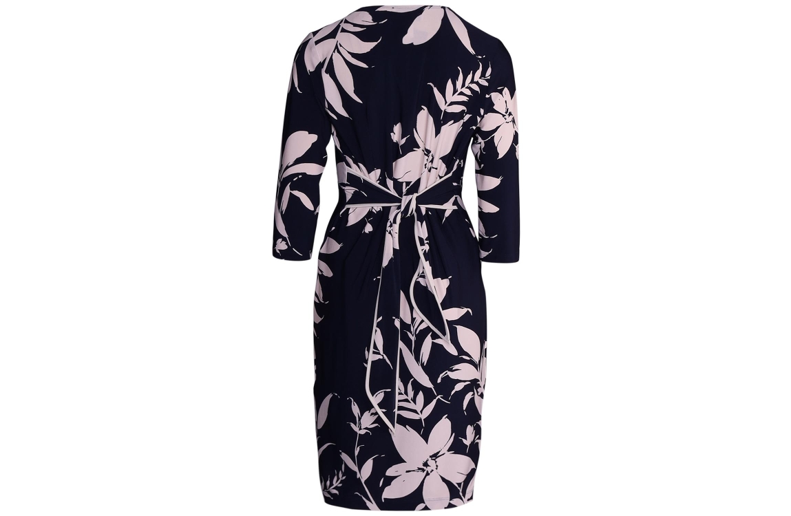 Joseph Ribkoff jurk 241056. Dit aangesloten model heeft een V-hals en driekwart mouwen. Deze blauwe jurk van Joseph Ribkoff heeft een all-over bloemenprint en een ceintuur rond de taille.