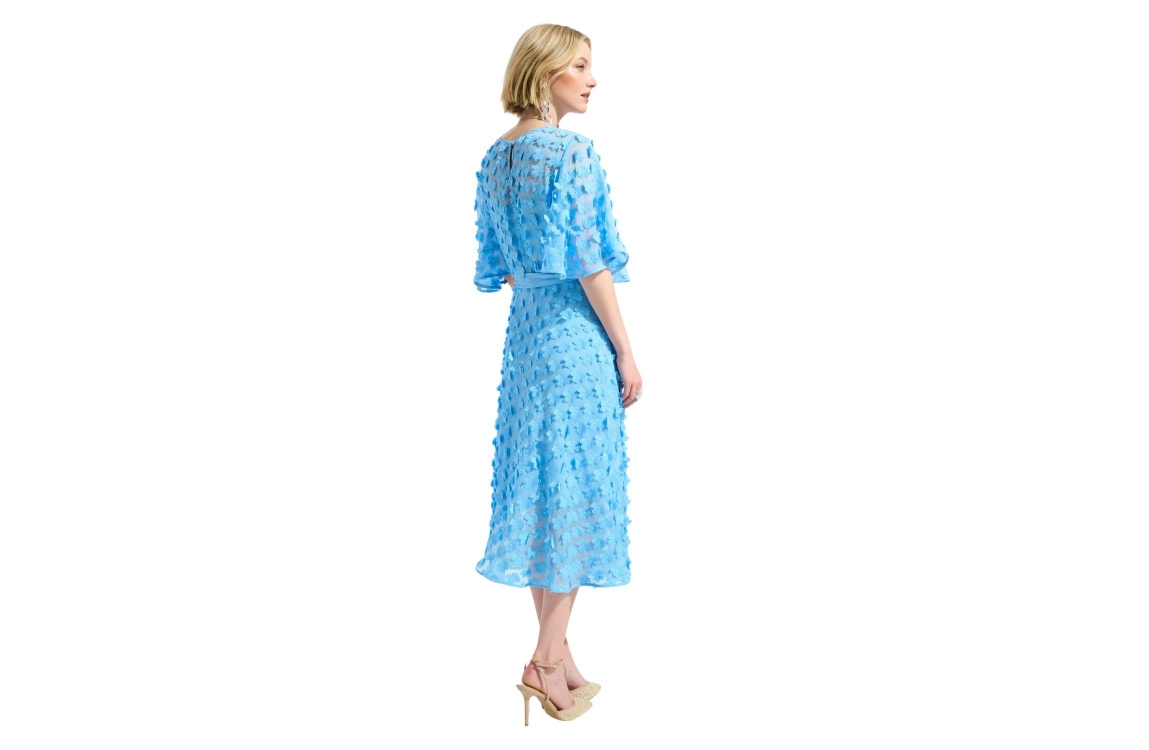 Joseph Ribkoff jurk 261738 4373. Dit rechtvallende model heeft een ronde halslijn met knoopsluiting en korte mouwen. Deze lichtblauwe jurk van Joseph Ribkoff is all-over bewerkt met decoratieve bloemen en is semi-transparant uitgevoerd. Het model beschikt over een onderjurk en ceintuur.