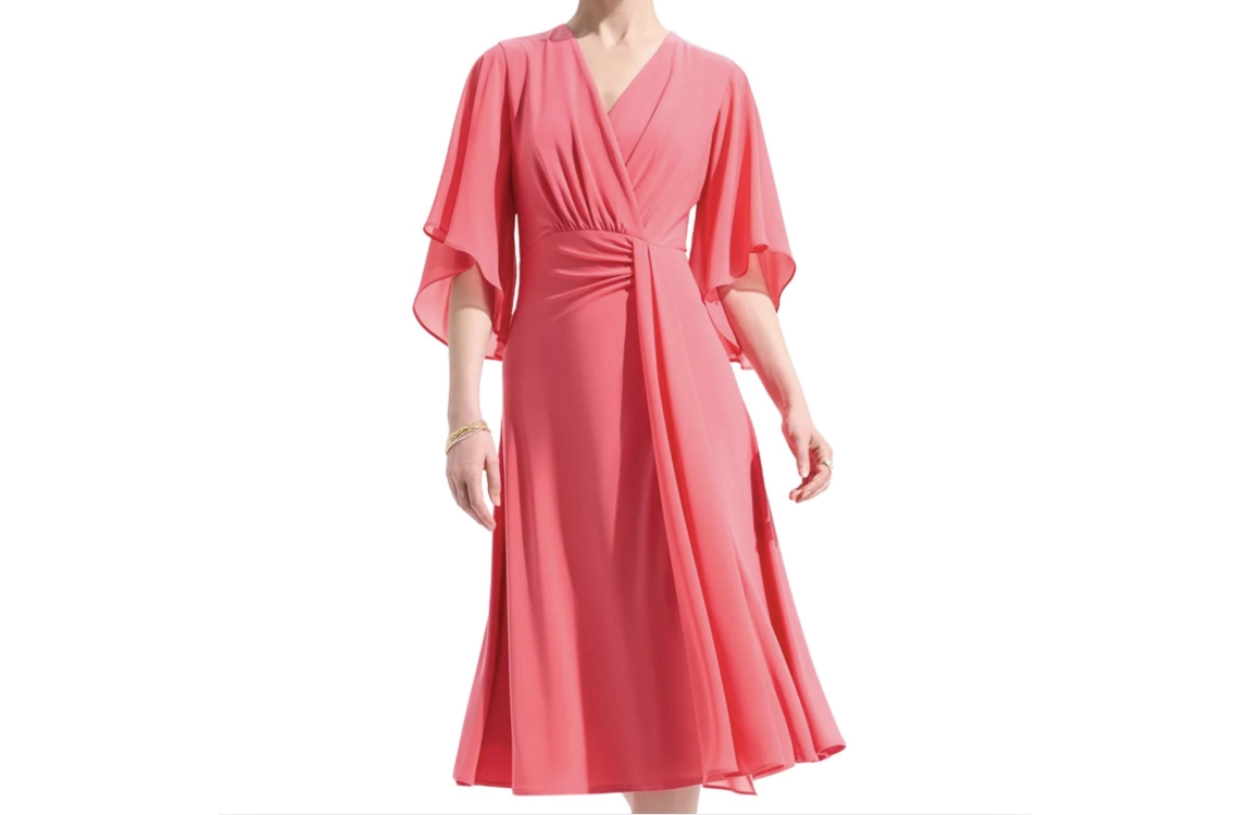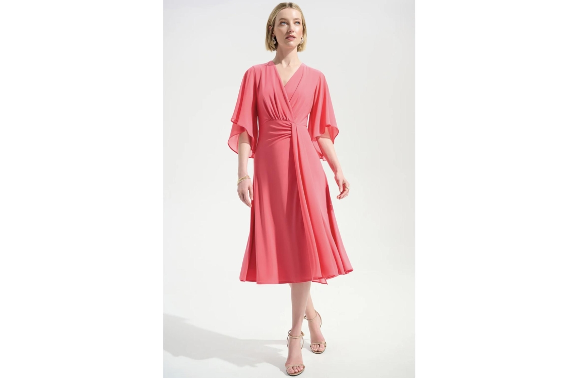 Joseph Ribkoff LDS jurk 261710. Dit soepelvallend model heeft een v-hals en korte semi-transparante mouwen. Deze roze jurk van Joseph Ribkoff is bewerkt met gedrappeerd detail aan de voorzijde en valt half lang. De stof is uitgevoerd in stretch kwaliteit.