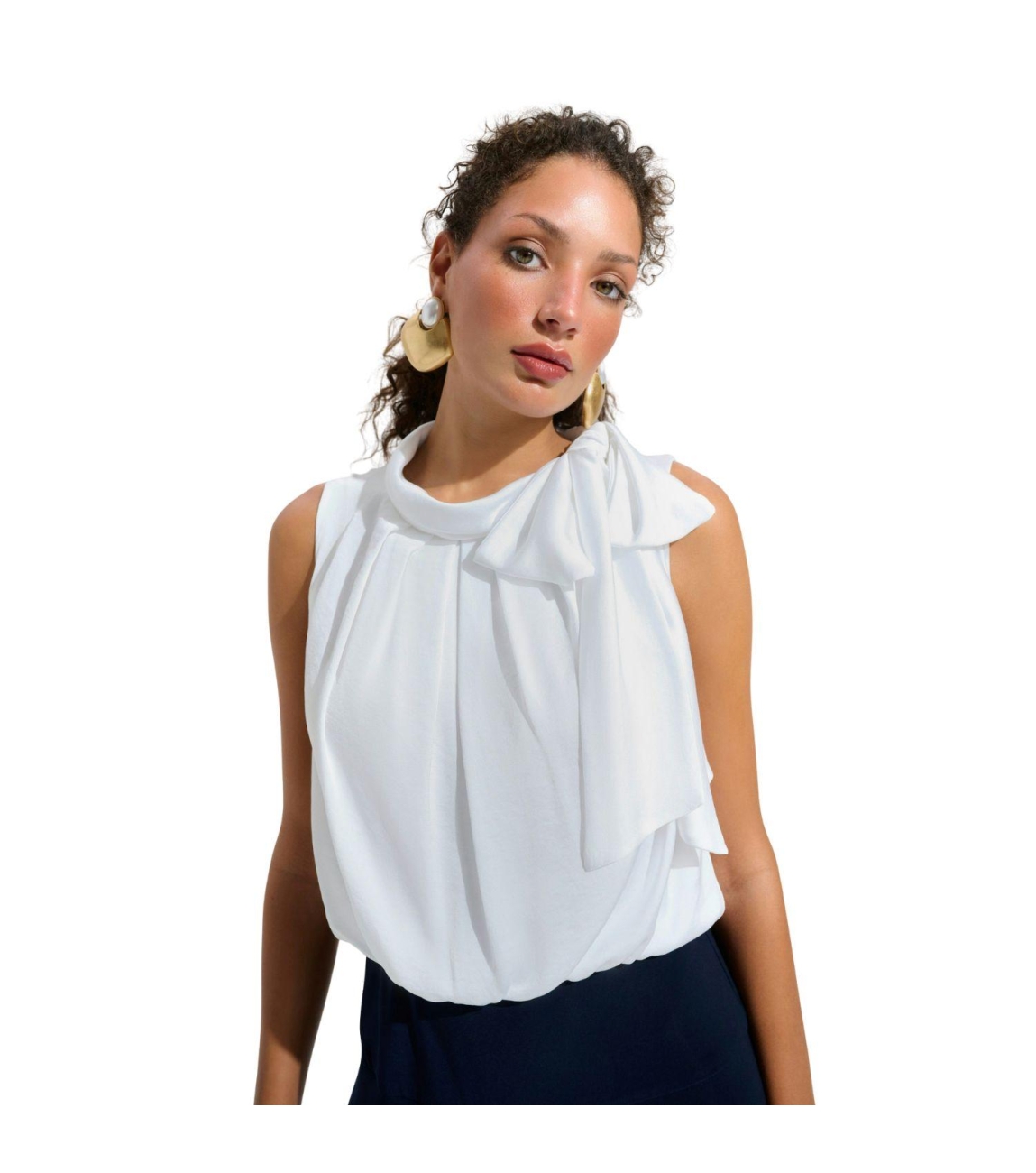 Joseph Ribkoff jumpsuit 221340S26 2922. Dit wide leg model heeft een losse, ronde kraag en is mouwloos. Deze donkerblauwe/off white jumpsuit van Joseph Ribkoff sluit aan de achterzijde door middel van een blinde ritssluiting en is op de halslijn gedetailleerd met een strikdetail. De donkerblauwe onderzijde is uitgevoerd in stretchkwaliteit.