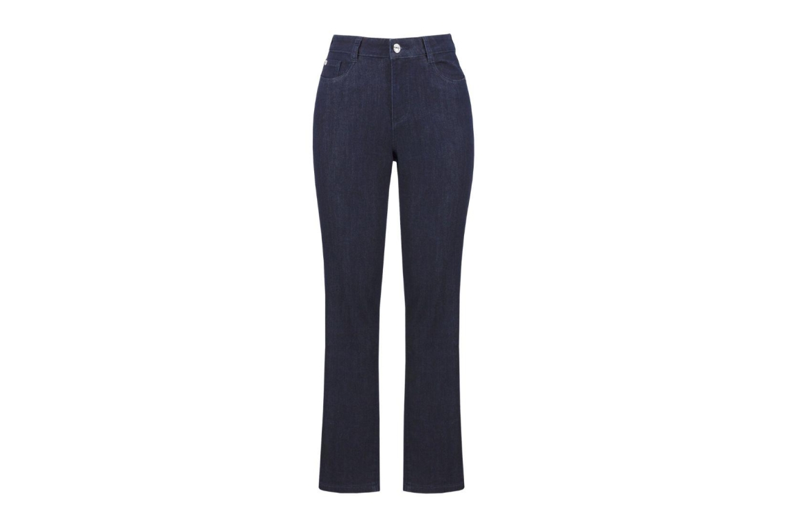 Joseph Ribkoff jeans 251968. Dit straight leg model sluit door middel van een knoop en rits en is afgewerkt met ceintuurlussen. Deze denim jeans van Joseph Ribkoff is uitgevoerd in een 5-pocket model.