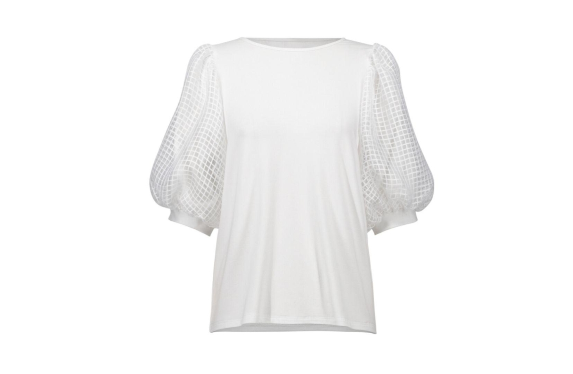 Joseph Ribkoff lds top. Dit rechtvallende model heeft een ronde kraag en driekwart mouwen. Deze witte top van Joseph Ribkoff heeft een pofmouw met een blokjes structuur.