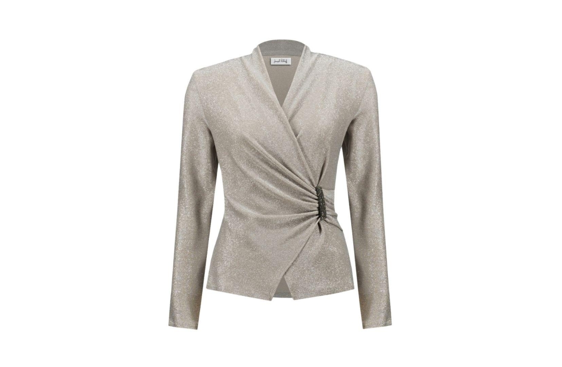 Joseph Ribkoff top 253789. Dit rechtvallend model is voorzien van een v-hals en heeft lange mouwen. Deze bruin/paarse top van Joseph Ribkoff beschikt over een overslag afgewerkt met een gespdetail. Dit model is all-over bewerkt met glitter.