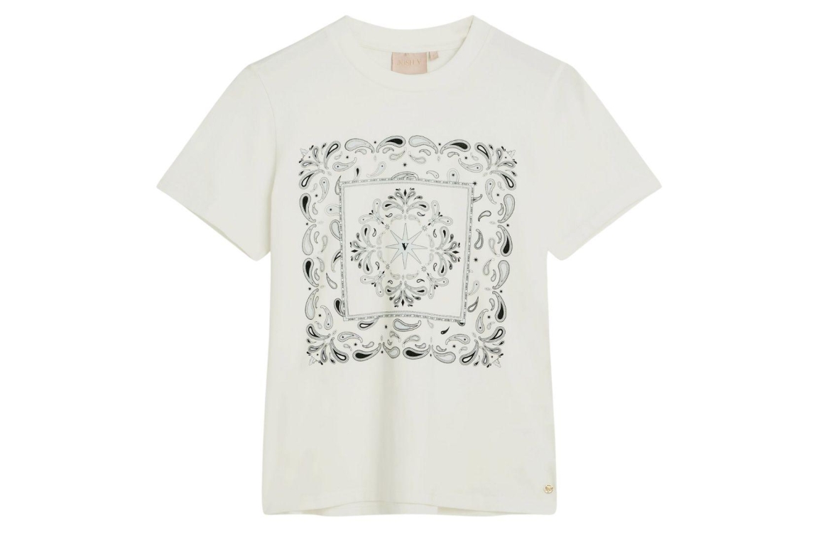 Josh V T-shirt Dorie Bandana JV-2505-0003. Dit rechtvallend model heeft een ronde hals en korte mouwen. Deze off white T-shirt van Josh V is op het voorpand bewerkt met een 'JOSH V' logoprint en is uitgevoerd in stretchkwaliteit.