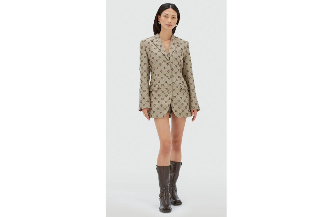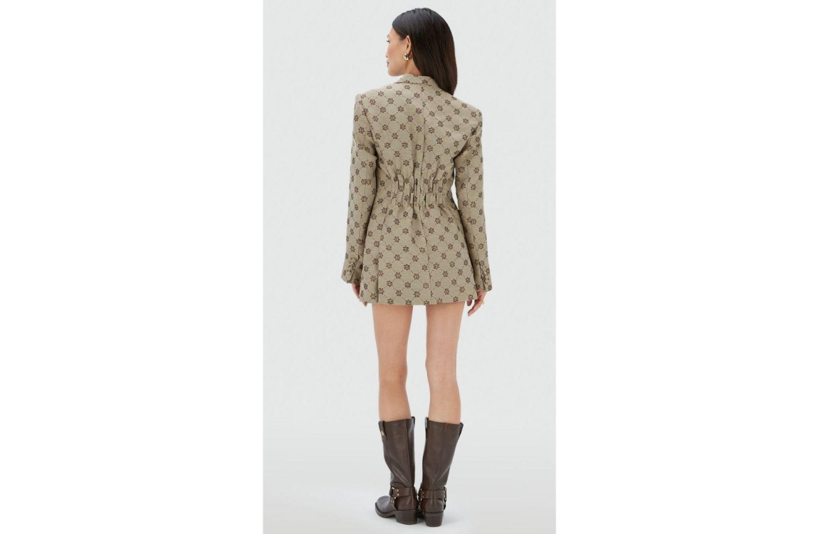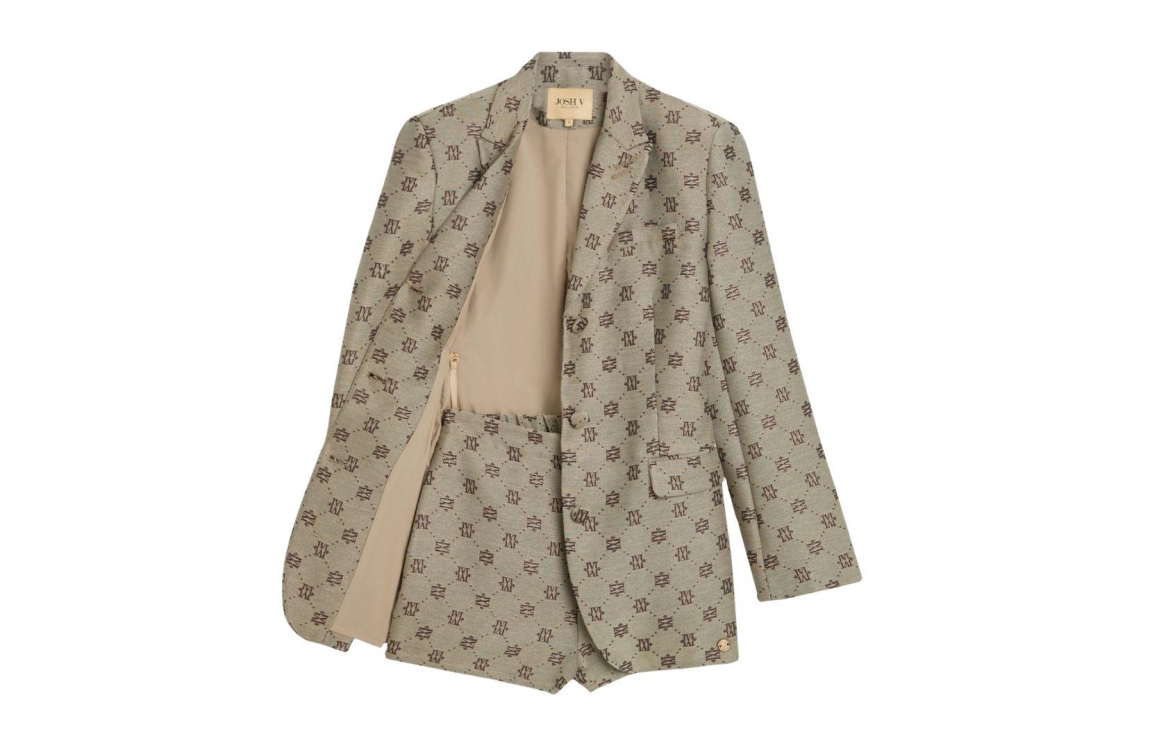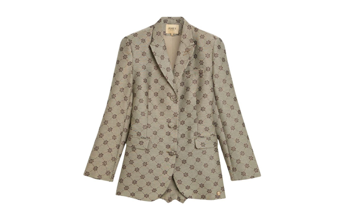 JOSH V Estrella blazerjurk JV-2510-0402. Dit  logo printed blazer dress heeft een oversized pasvorm die aansluit in de taille. Deze bruine lurex jurk van Josh V beschikt over schoudervullingen en een uitneembaar shortje. Dit model kan  zowel als jurk gedragen worden, als oversized blazer en als shortje zonder blazer.