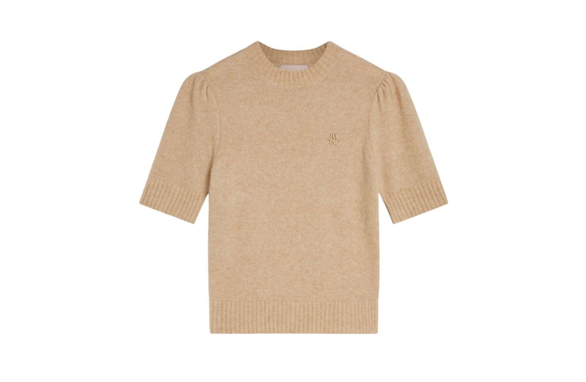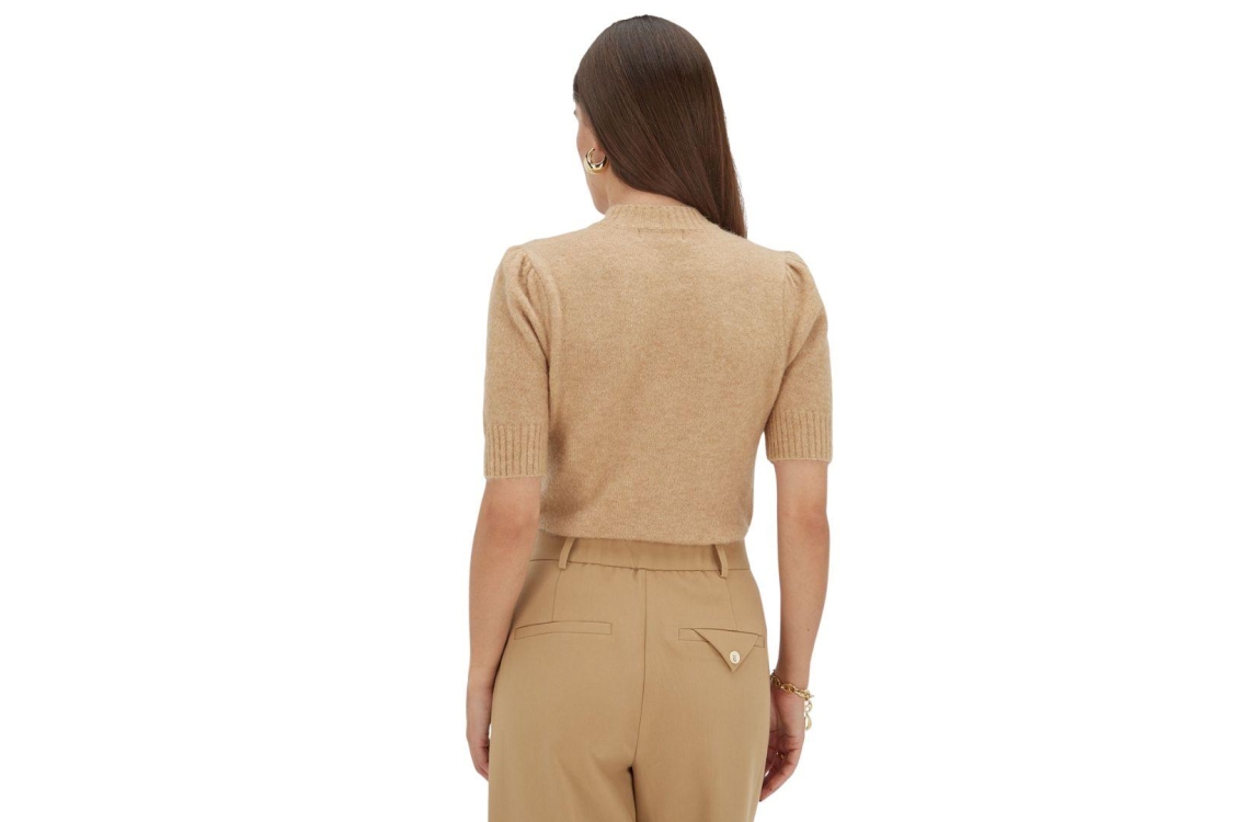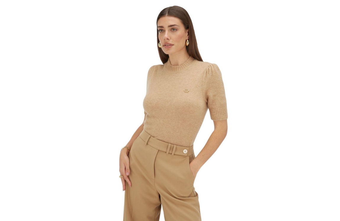 Josh V shirt FRANKA JV-2508-0204. Dit rechtvallend model is voorzien van een ronde hals en heeft korte pofmouwen. Deze lichtbruine wollen shirt van Josh V is afgewerkt met een goudkleurige monogram logo.