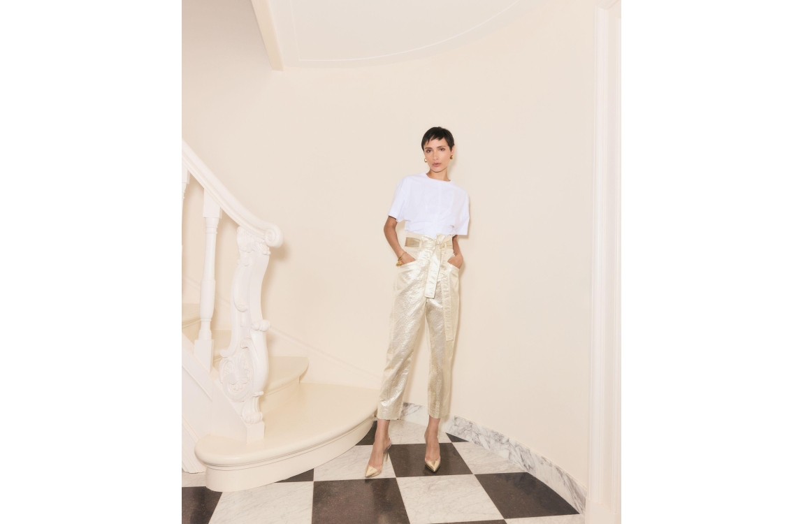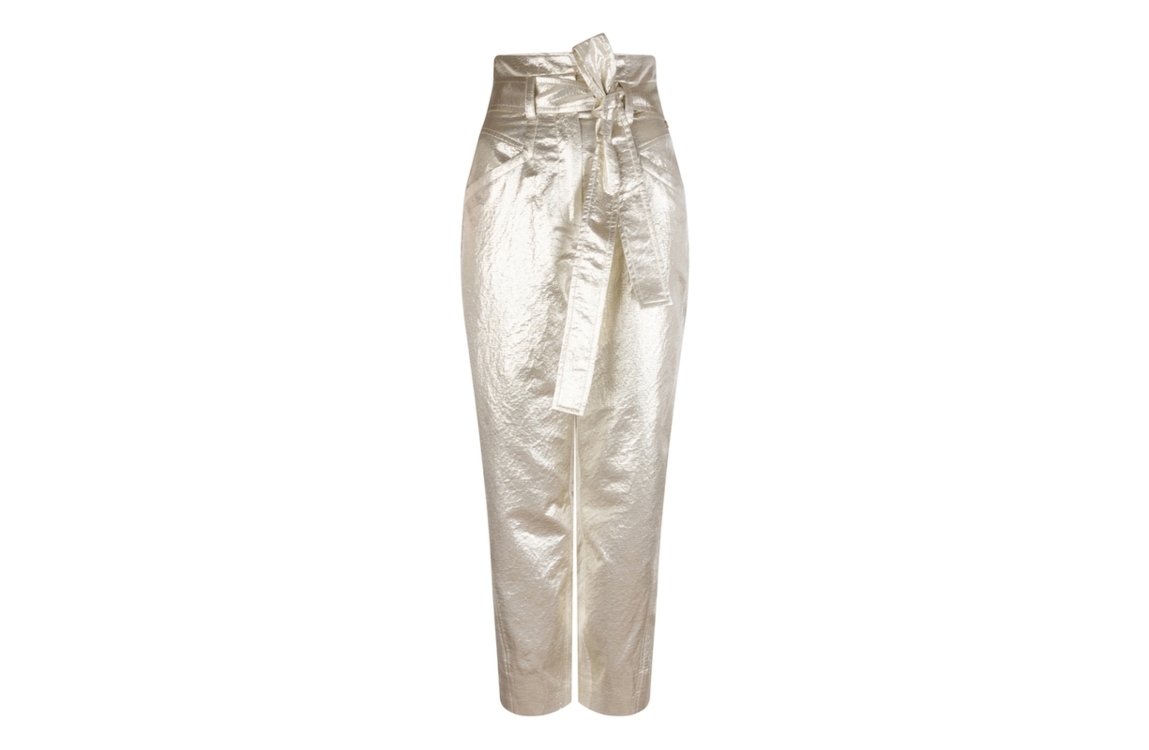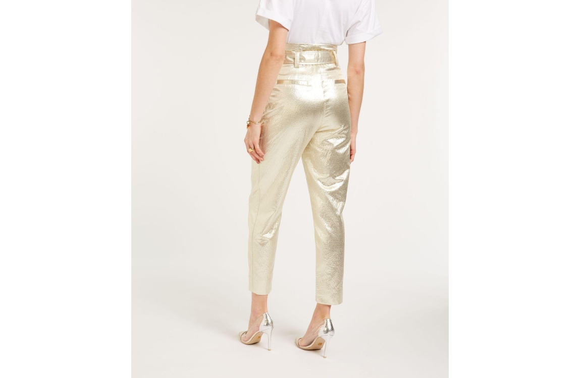 Josh V broek Hayden. Dit high waisted model sluit door middel van een haak, ritssluiting en strikkoord en heeft enkellange pijpen. Dit gouden model is afgewerkt met twee steekzakken aan de voorzijde en twee paspelzakken aan de achterzijde.