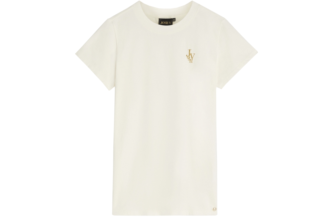 Josh V T-shirt Zoe JV-5000-0004. Dit rechtvallend model is voorzien van een ronde hals en heeft korte mouwen. Deze off white T-shirt van Josh V is bewerkt met een goudkleurige geborduurd merkopdruk aan de linker voorzijde.