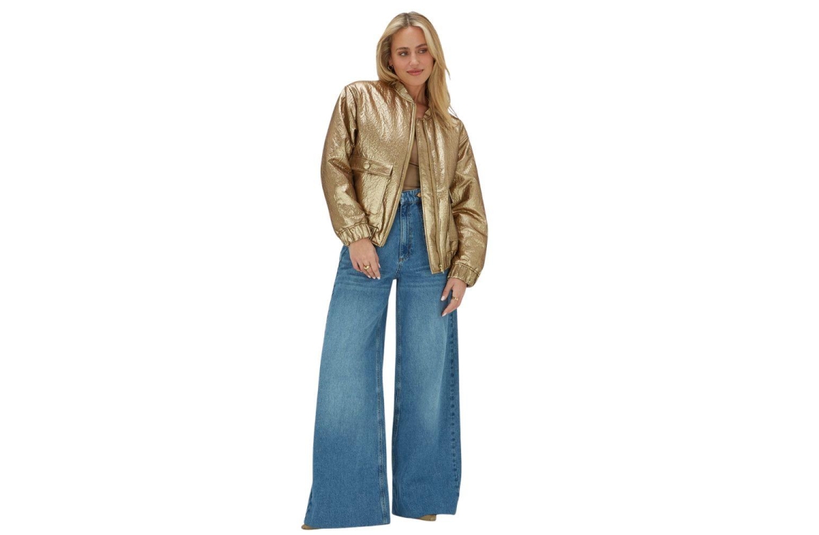Josh V bomberjas Kelsey JV-2602-0901. Dit bomber model heeft een ronde halslijn en lange mouwen. Deze goudkleurige bomberjas van Josh V sluit aan de voorzijde door middel van een rits en is uitgevoerd in een metallic-look. Het model is voorzien van twee decoratieve klepzakken met steekzakken en is afgewerkt met een elastische zoom.