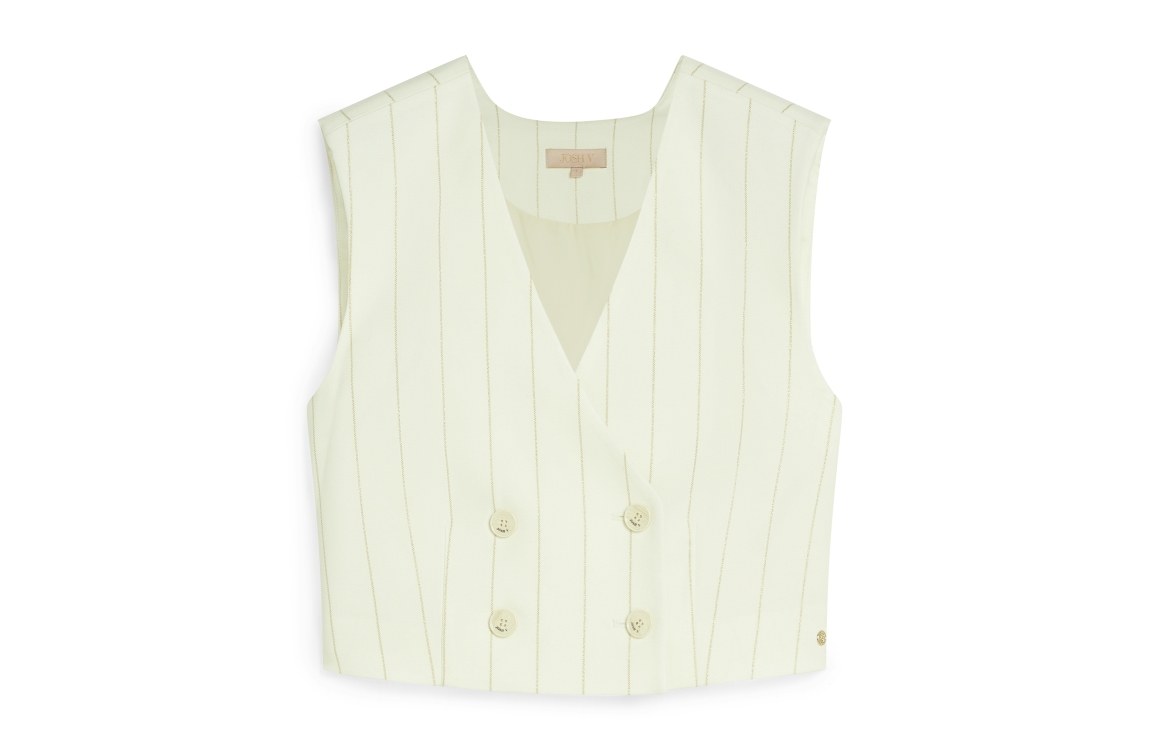 Josh V Leva gilet jv-2506-0107. Dit rechtvallende model heeft een v-hals, is mouwloos en sluit door middel van knopen. Dit cropped gilet van Josh V is ecru kleurig met een lurex streepje.