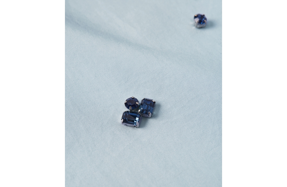 Josh V blouse Lova 2502-0108. Dit oversized model heeft een kraag, lange mouwen en sluit door middel van knopen. Deze blauwe blouse van Josh V is bewerkt met donkerblauwe sierstenen.