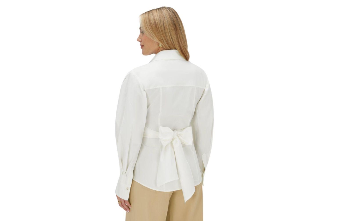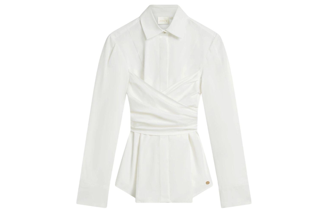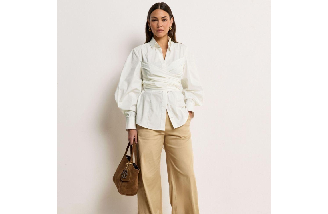 Josh V blouse Luann JV-2602-0104 033. Dit getailleerde model heeft een kraag en lange mouwen. Deze witte blouse van Josh V sluit aan de voorzijde door middel van blinde knopen en is voorzien van een wrap-detail in de taille. Het model is afgewerkt met goudkleurige logoknopen.