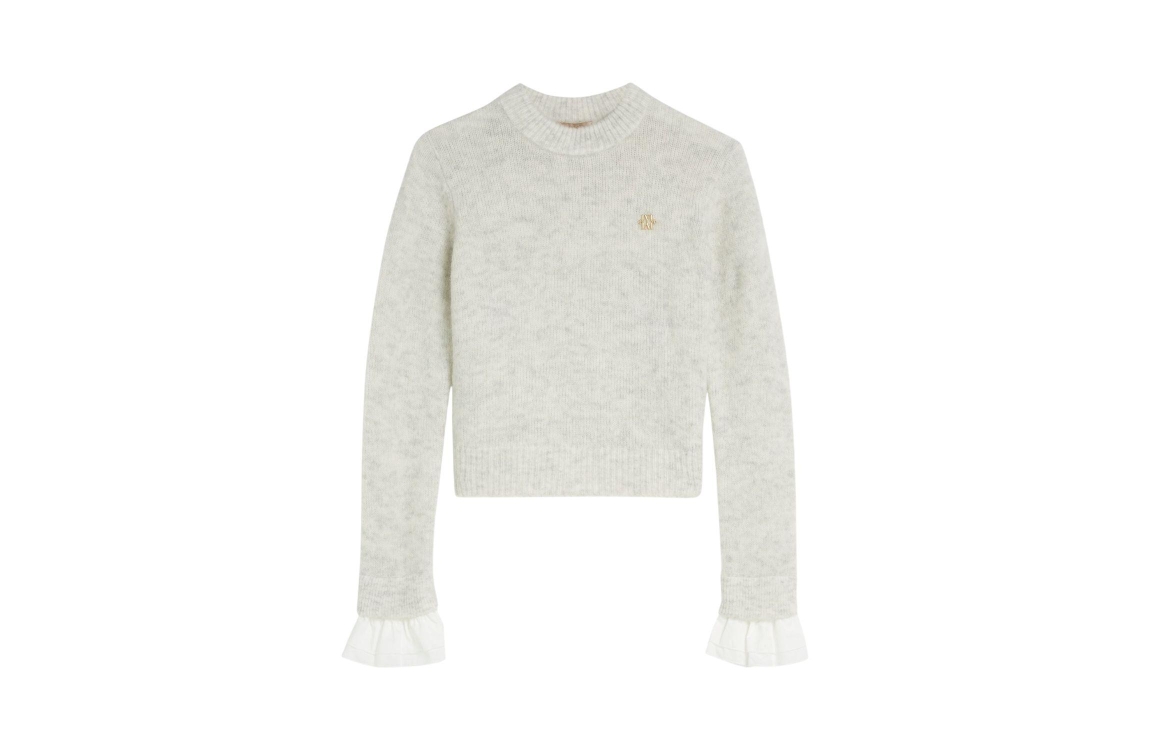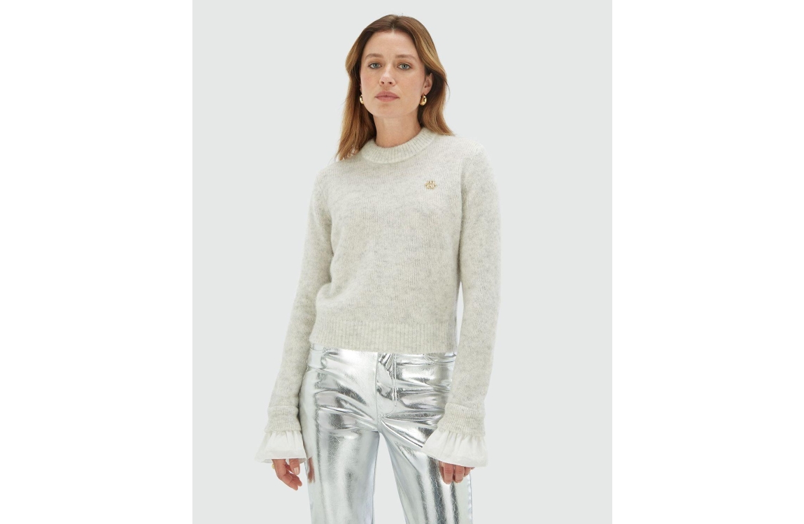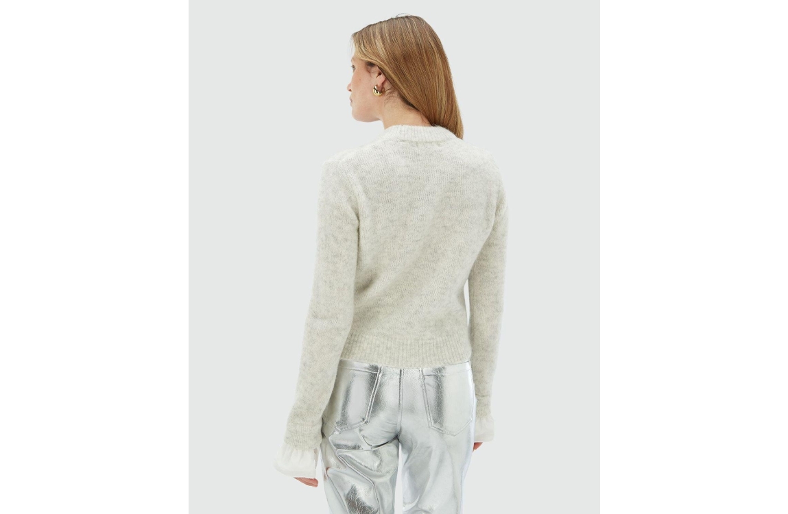 Josh V MAYA 067 grey melange. Dit rechtvallende model is voorzien van een ronde hals en heeft lange mouwen. Deze grijze wollen trui van Josh V is afgewerkt met een goudkleurige monogram logo. Dit model is aan de uiteinden afgewerkt met afneembare volant details.