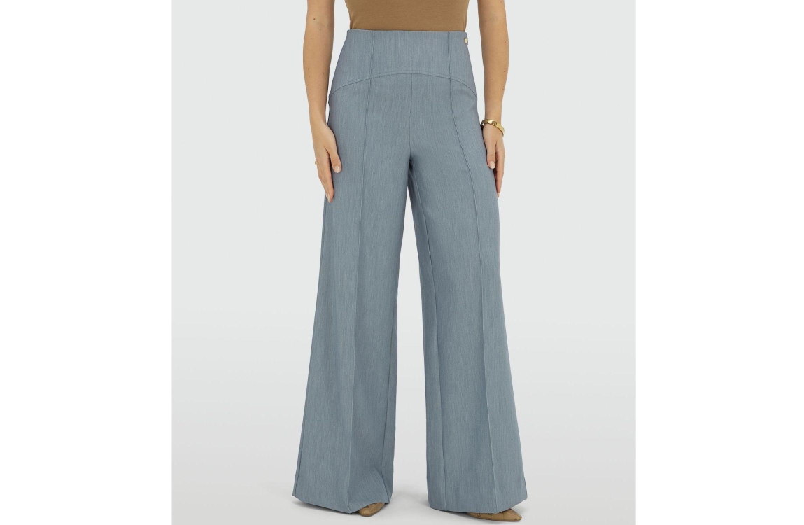 Josh V MICHELLA high-waisted wide leg trousers 625 sky blue melange. Dit wijdvallende model sluit door middel van een blinde ritssluiting aan de zijkant. Deze blauwe pantalon van Josh V valt high waisted.