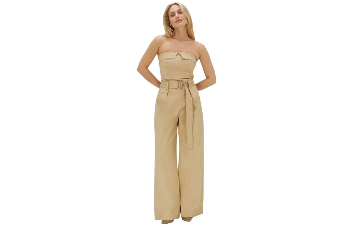 Josh V jumpsuit MYRA JV-2602-0701. Dit strappless model heeft een aangesloten bovenstuk en wijde broekspijpen. Deze camelkleurige jumpsuit van Josh V sluit aan de achterzijde door middel van een rits en is voorzien van een ceintuur. Het model beschikt over twee steekzakken aan de voorzijde en twee paspelzakken aan de achterzijde.