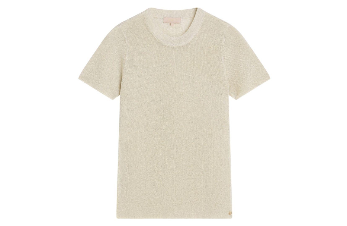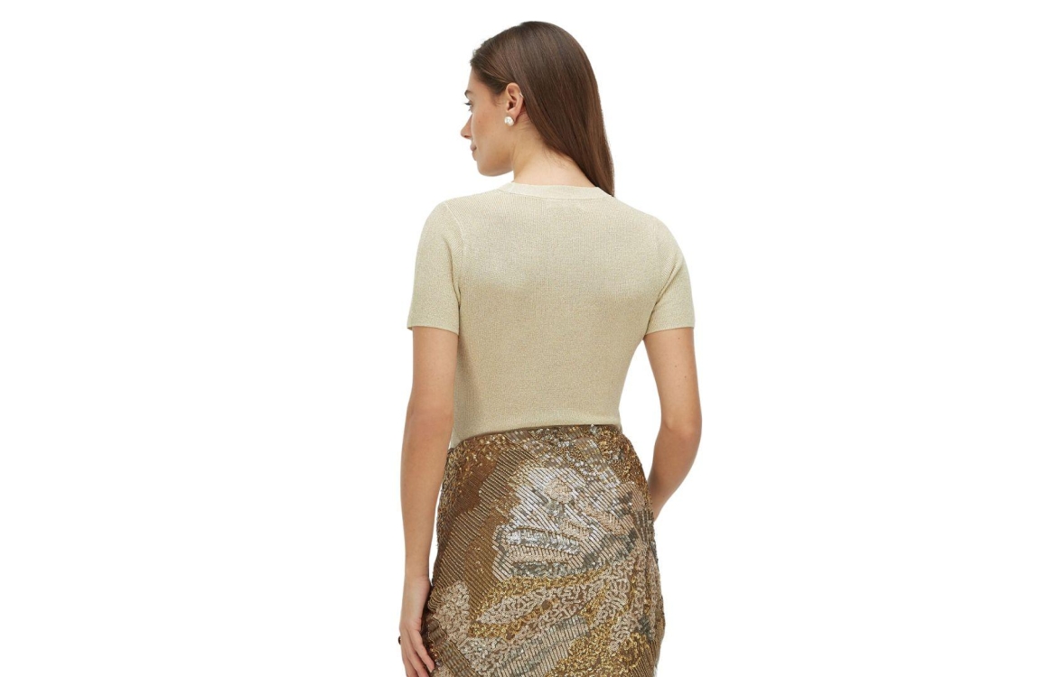 Josh V top Rio JV-2501-2101. Dit aangesloten model heeft een ronde hals en korte mouwen. Deze goudkleurige top van Josh V is all-over bewerkt met glitter lurex en is uitgevoerd in een fijn gebreide kwaliteit.