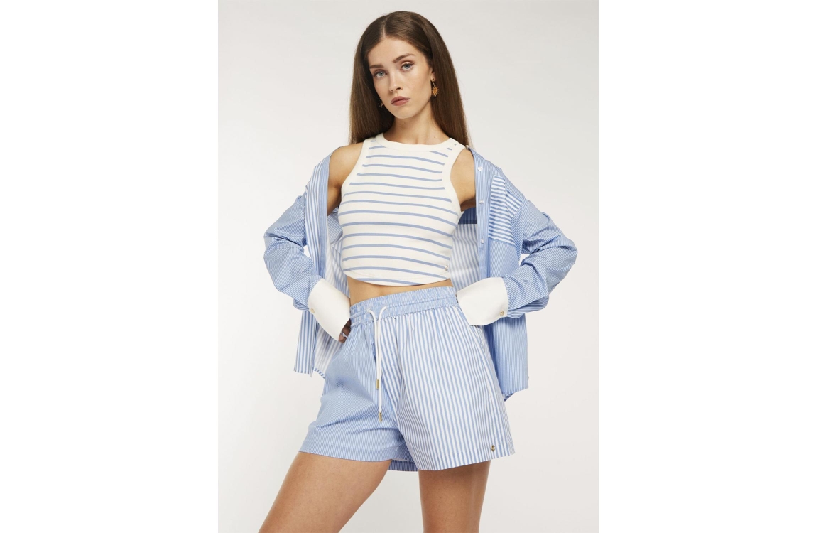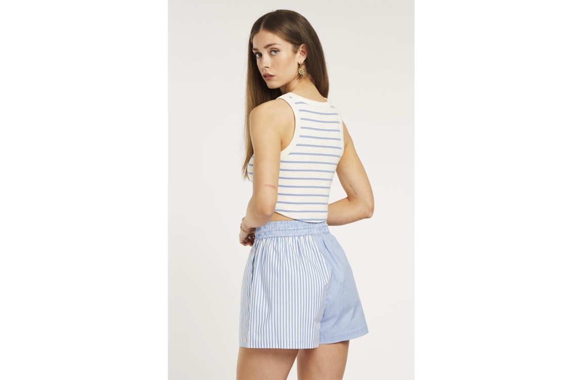 Josh V short Sherry JV-2405-0603. Dit rechtvallend model sluit door middel van een elastische boord en trekkoorden. Deze blauwe/witte short van Josh V is voorzien van twee steekzakken aan de voorzijde en is bewerkt met een streepprint.