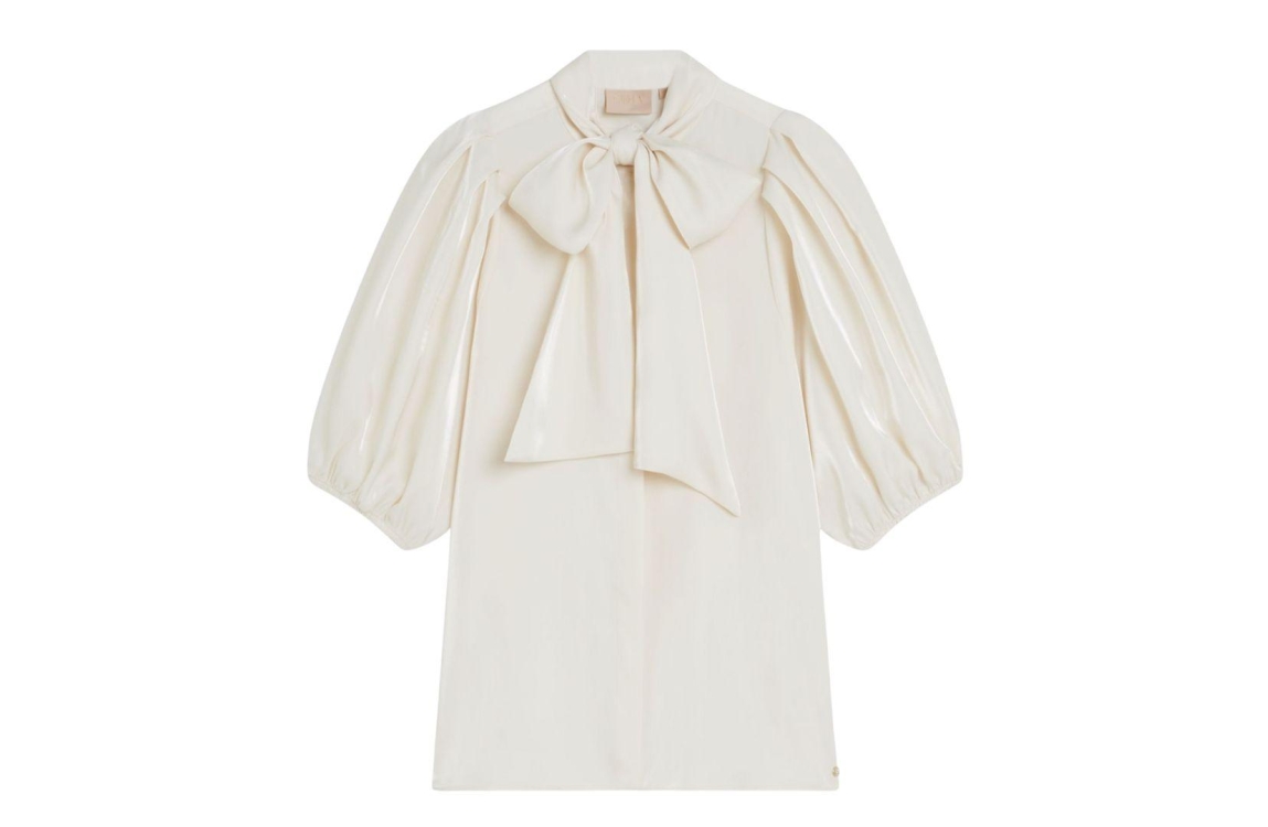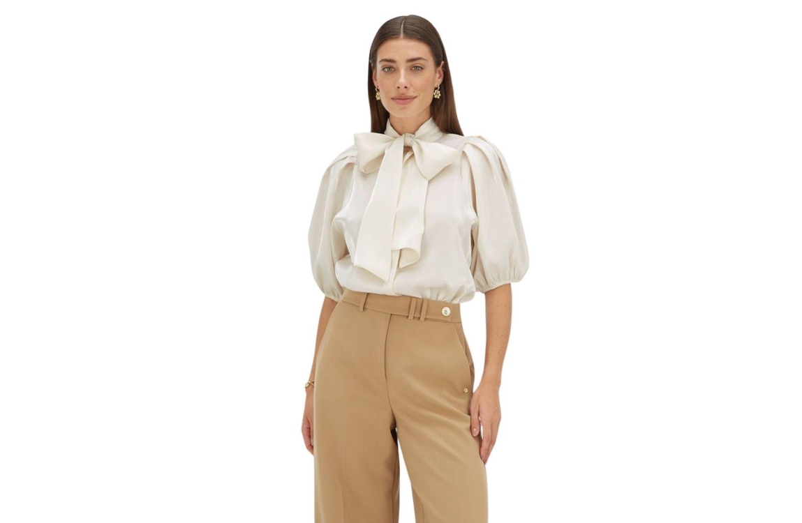 Josh V SYLVIA blouse JV-2508-0108. Dit rechtvallend model is voorzien van een ronde hals met een afneembaar strik en heeft korte pofmouwen. Deze witte satijnen look blouse van Josh V sluit door middel van knopen.