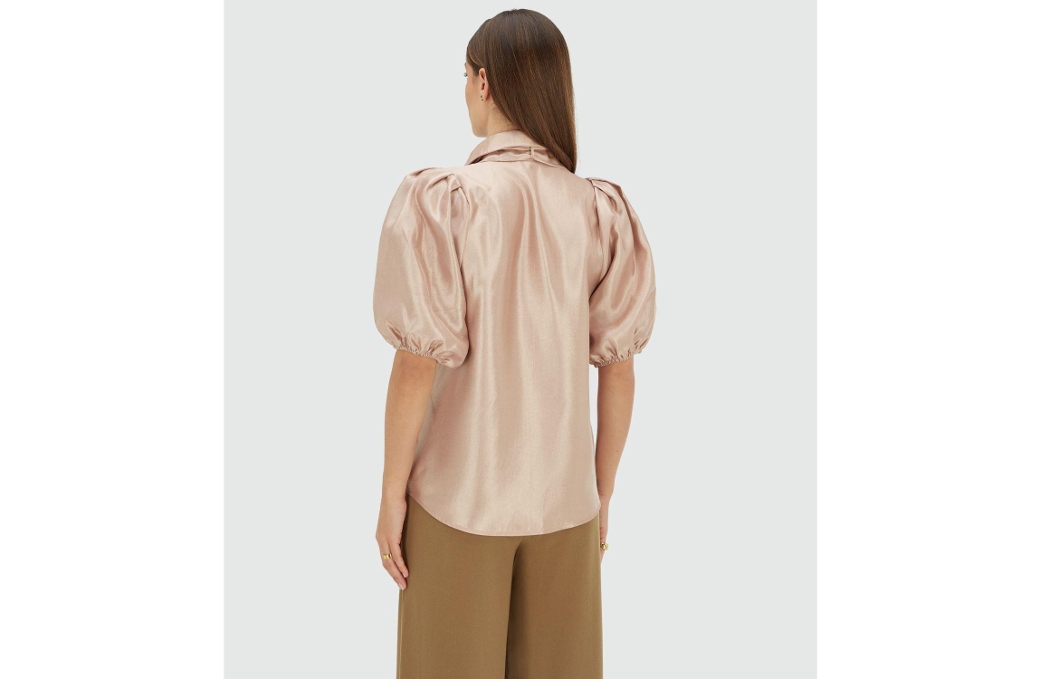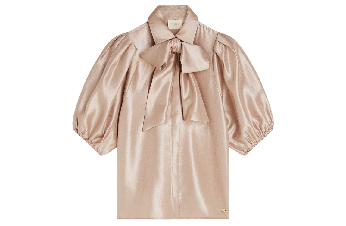Josh V SYLVIANA regular fit blouse 813 dusty pink. Dit rechtvallende model is voorzien van een kraag met een afneembaar strik en heeft korte pofmouwen. Deze roze satijnen look blouse van Josh V sluit door middel van knopen.