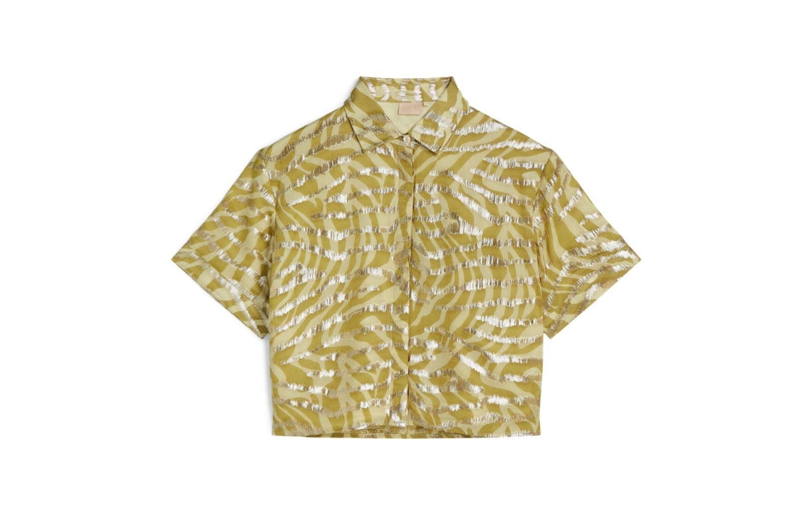 Josh V blouse Ziya 2504-0107. Dit rechtvallende model is voorzien van een kraag, korte mouwen en sluit door middel van knopen. Deze groene blouse van Josh V is een cropped blouse. Dit model is all-over bewerkt met gouden details.